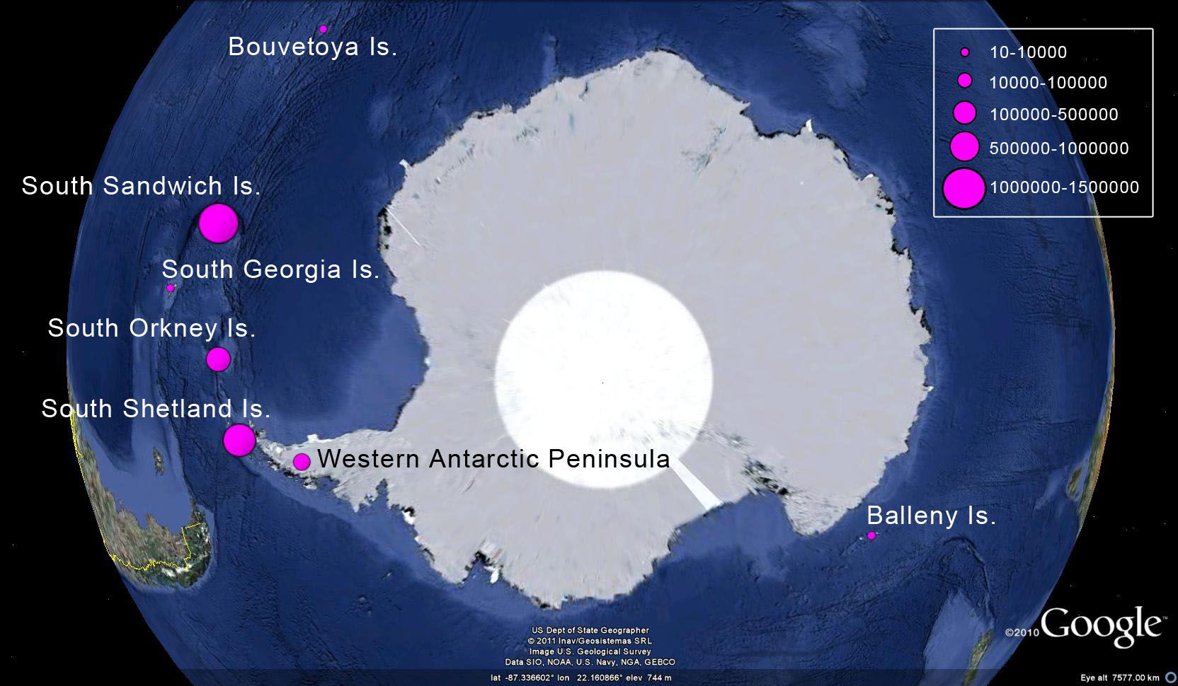 Circumpolar, primarily located on the Antarctic Peninsula, South Shetland, South